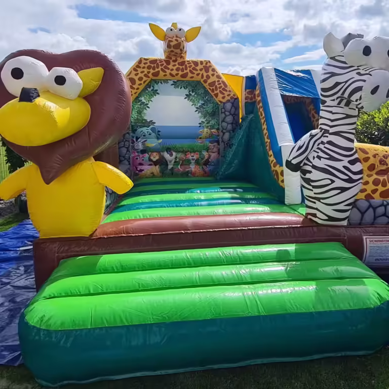 Viele Hüpfburgen sind zwar funktional, sehen aber langweilig aus. Kein Wunder also, dass Kinder diese oft links liegen lassen. Wenn Sie unsere professionelle Dschungel Hüpfburg mieten, sieht die Sache hingegen ganz anders aus. Denn dieses Spitzenmodell unserer Hüpfburg Vermietung ist mit Maßen von 5,20 x 4,00 x 4,00 Metern ein echter Hingucker im XL-Format. Dafür sorgen nicht nur das detailreiche Design und die bunten Farben, die Kids förmlich anziehen. Es sind vor allem die vielen riesigen Figuren, die für leuchtende Kinderaugen sorgen. So flankieren eine großer, freundlich blickender Löwe und ein lustiges Zebra den Spielbereich. Zudem gibt eine Giraffe und Papageien zu entdecken. Kein Wunder also, dass bei unserer Hüpfburg Vermietung dieses Modell besonders gefragt🤩 ist.