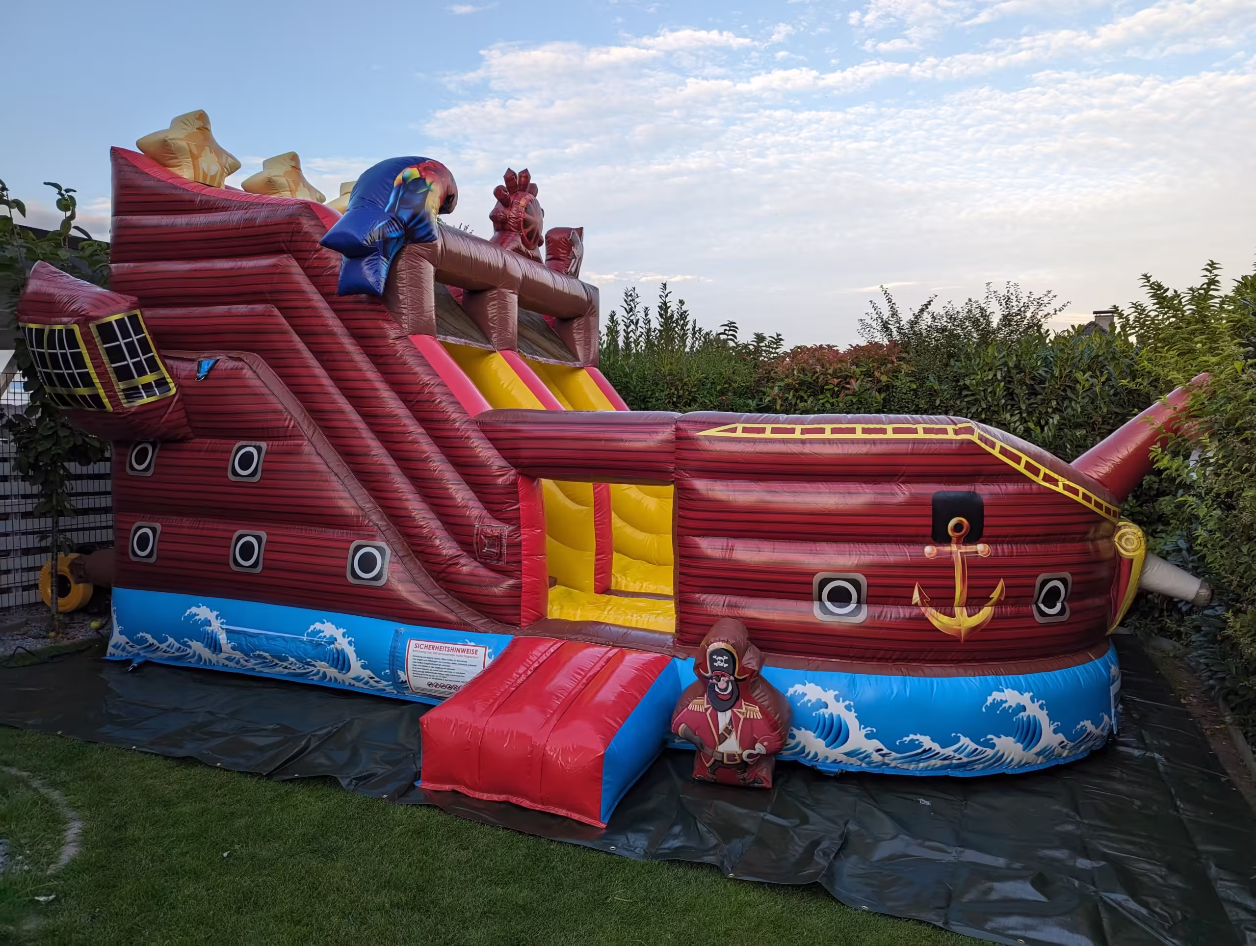 In und an Gewässern wie dem Gabelweiher in Espelkamp gibt es für Jungen und Mädchen zwar einiges zu sehen. Allerdings drohen hier auch Gefahren und irgendwann Langeweile. So sind hier spannende Schiffe Mangelware. Wenn Sie eine Hüpfburg mieten in Espelkamp, können Sie Kids hingegen ein tolles Schiff bescheren, das sich bespielen, behüpfen sowie berutschen lässt – nämlich unsere Hüpfburg Piratenschiff. Das fördert nicht nur die Mobilität von Kindern, sondern regt auch ihre Fantasie an. Denn hier findet sich alles, was die Herzen von jungen Freibeuterinnen und Freibeutern höher schlagen lässt – etwa Pirat, Papagei und Steuerrad. Landratten wie Eltern dürfen natürlich nur in Ausnahmefällen an Bord, damit die Kids ungestört und dennoch absolut sicher toben können.